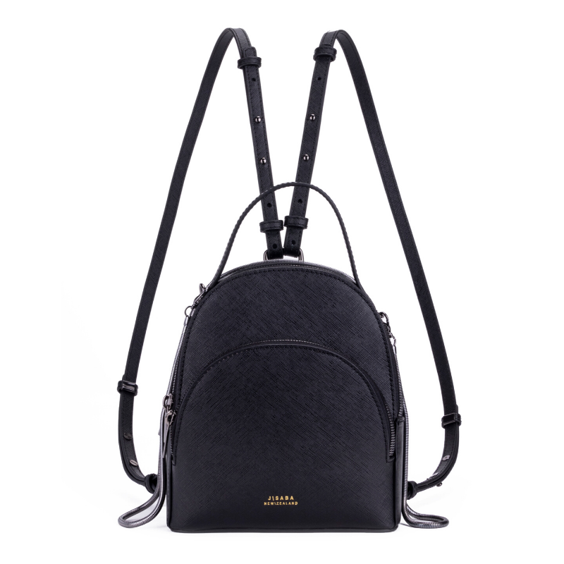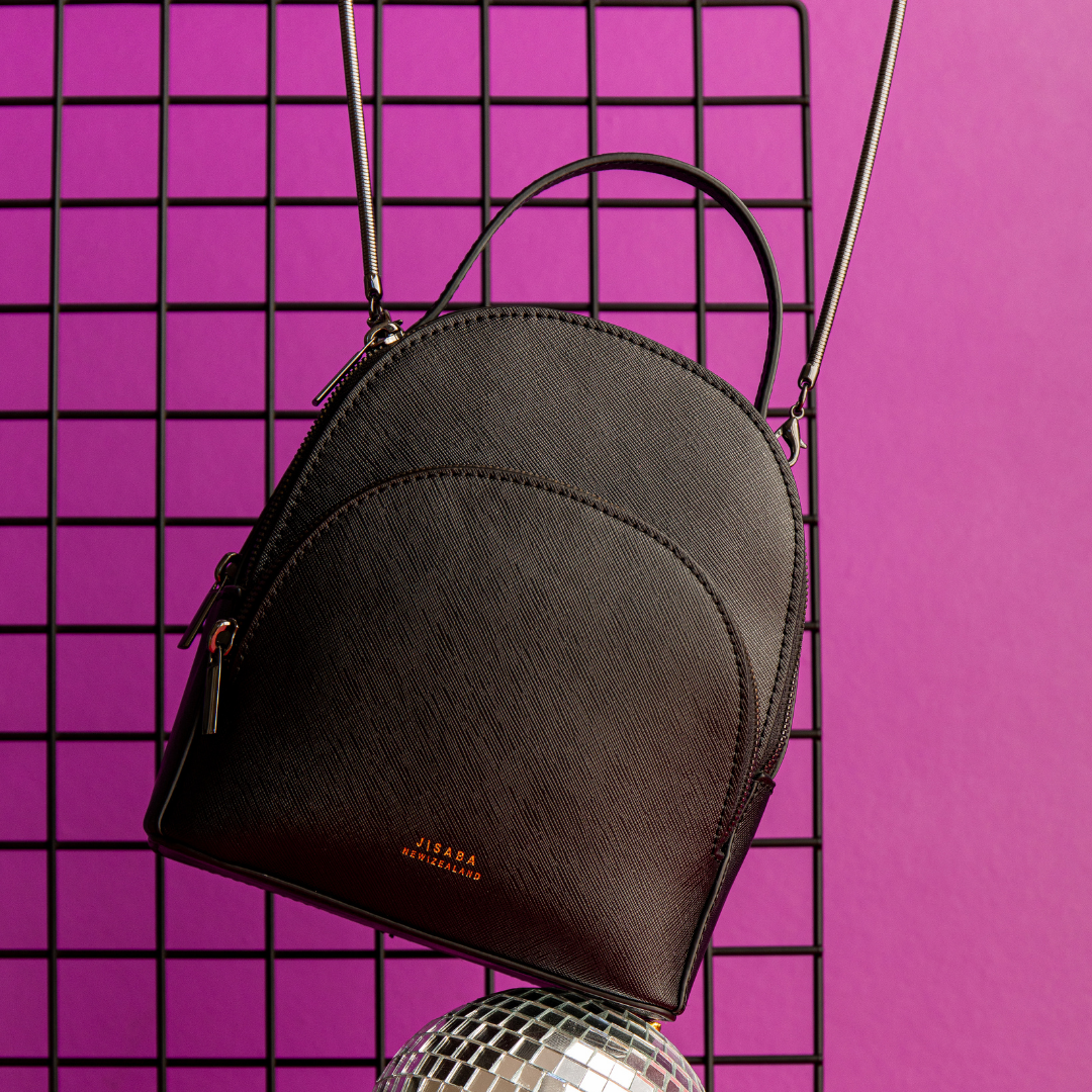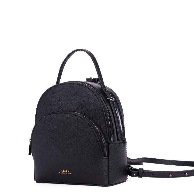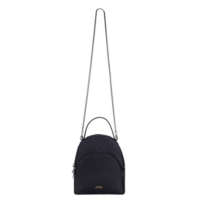 A highly functional crossbody backpack is constructed using black saffiano leather. She features a snake chain strap that swiftly converts the backpack into a crossbody. Features 3 compartments. The bag is equipped with with 5 card slots, a zip pocket, an open pocket a key chain lanyard, 2 leather removable backpack straps and 1 snake chain. Walk, run, rest, think, work and party with this piece.