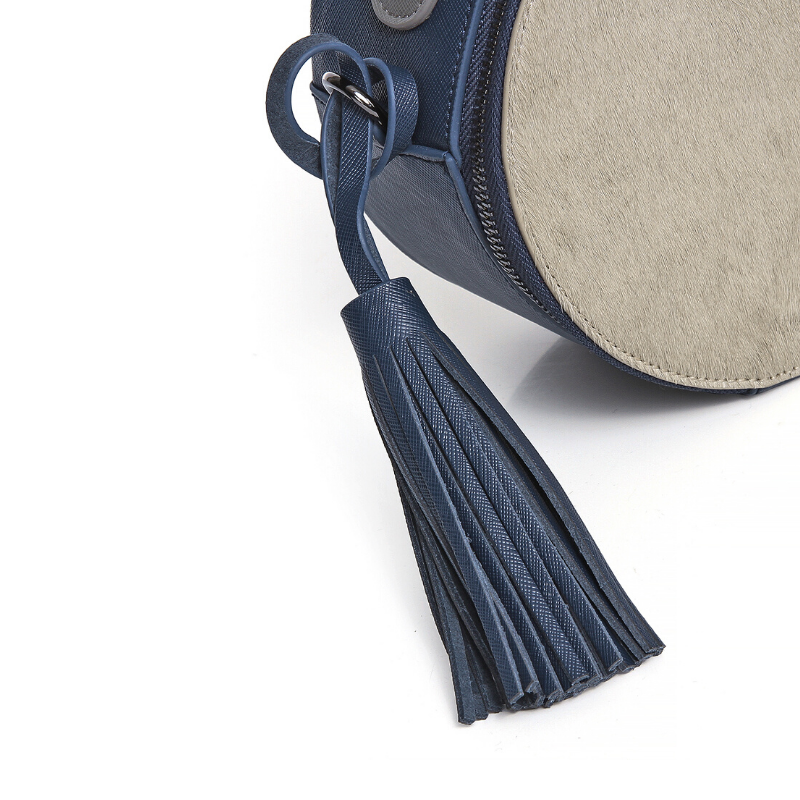 This stylish standout bag is crafted meticulously using navy saffiano leather and lush ash-beige pony effect cow-hide. The detachable guitar strap features gunmetal adjustable rivets with an additional metal strap to suit your mood. Converts to a cloth without straps.
